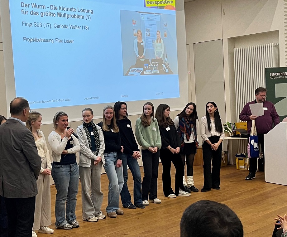 Souverän haben sie ihre Projekte präsentiert und den ganzen Tag Rede und Antwort gestanden. Während eine Gruppe selbst konstruierte Modellmoore im kleinen Maßstab präsentierte, haben sich zwei andere mit dem Plastikfressverhalten von Würmen beschäftigt. Mit den Sonderpreisen des Senckenbergmuseums sind alle sehr zufrieden. Vor allem, da es sich bei uns um echte und alleine entwickelte und vorgestellte Schülerprojekte handelt.