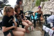 Es war schön warm, sprich: viel zu heiß, an die 40 Grad und es gab einen Pool, der für uns aber nicht in Frage kam, weil man da Badekappen tragen musste. Da es daneben aber auch Trampoline gab, war es in unserer Freizeit sehr lustig.