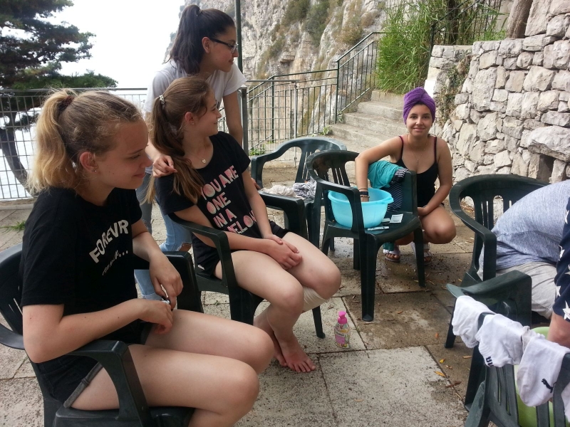 Wir kamen in unseren Bungalows an und sind am nächsten Tag mit einer kleinen Bahn, der Circumvesuviana, nach Pompei gefahren und haben diese Ruinen-Stadt besichtigt. Es war sehr beeindruckend durch die Straßen zu laufen und sich vorzustellen, wie die Menschen früher gelebt haben. Danach haben wir an bestimmten Orten in Pompeji: Theater, Thermen, Amphitheater, Gräberstraße, unsere Referate vorbereitet, die wir am Freitag vortragen müssen. Anschließend sind wir wieder zu den Bungalows gefahren und sind nach dem Abendessen zum Meer gegangen, um unsere Füße ins Wasser zu halten:) (Vanessa Schwanz, 8b)