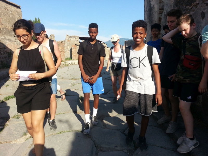 Außerdem blickt man auch direkt zum Vesuv, von dem alle sprechen und der mit seinen Lavamassen so viele Tausend getötet hatte. Man sieht dort auch, wie Archäologen noch weiter Dinge ausgraben, die noch immer verschüttet da liegen. Das zeigt, wie langsam, vorsichtig und geduldig man dort arbeiten muss. Insgesamt hat es mich gefreut, dass wir in Pompeji waren und ich mir jetzt alles so viel bildlicher vorstellen kann, wenn wir im Lateinunterricht drüber sprechen. (Andu Kelati, 8e)