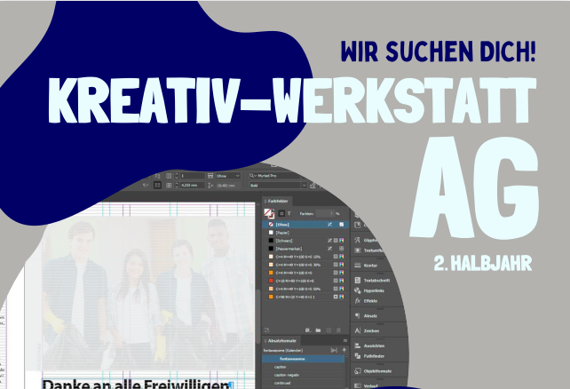 Wir suchen interessierte und motivierte Schülerinnen und Schüler, die Lust haben, an unserer Festschrift zu arbeiten. Uns stehen Grafiker*innen zur Verfügung, die uns alles rund um die Gestaltung einer Buchseite sowie die Arbeit mit dem Tablet und dem Programm indesign beibringen werden. Wer also einmal aktiv die Welt eines Verlags oder einer Redaktion erleben möchte, ist bei uns für das nächste Halbjahr genau richtig!